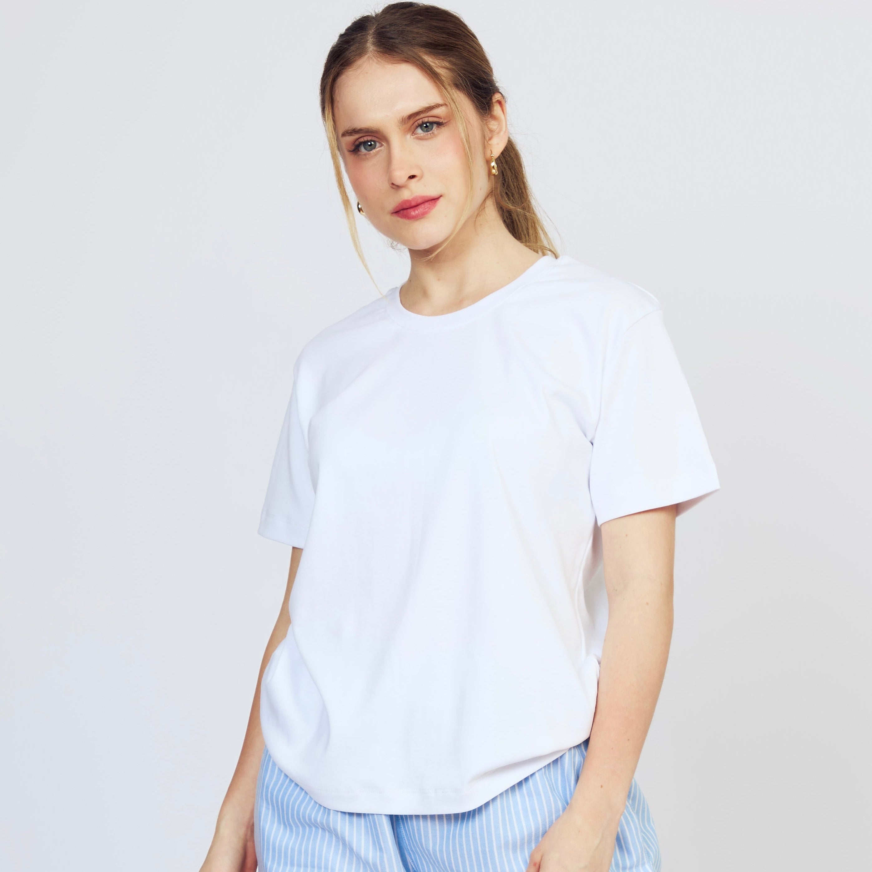 El polo blanco de algodón pima es ese básico que nunca pasa desapercibido. Su textura ultra suave y caída ligera lo hacen ideal para acompañar tu set de pijama o para integrarlo en tus looks diarios con elegancia minimalista.